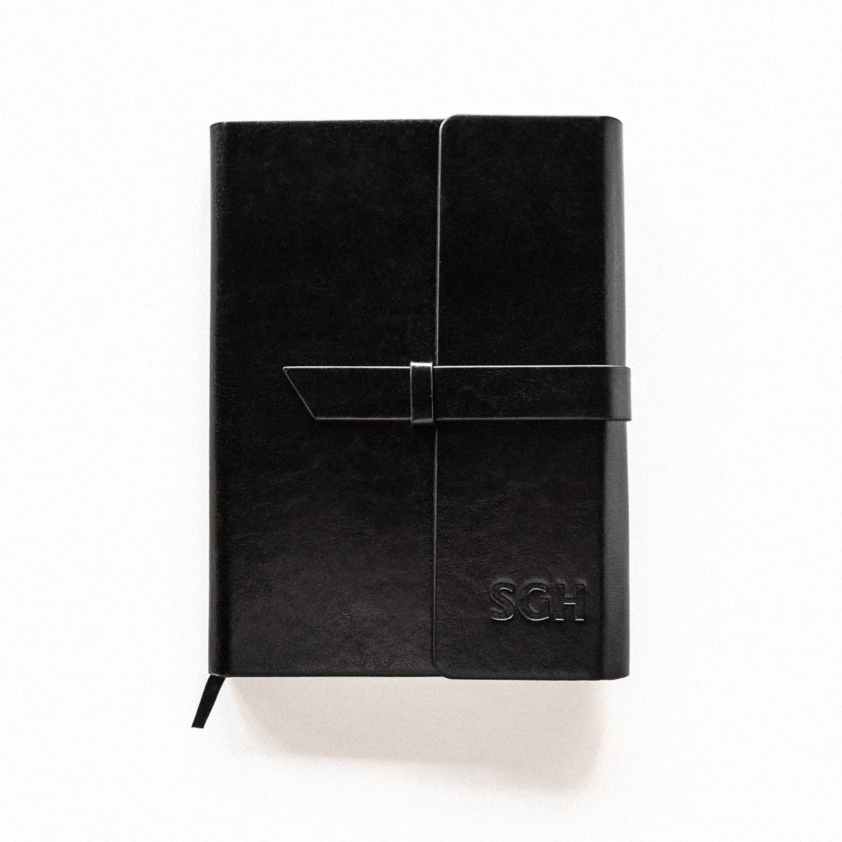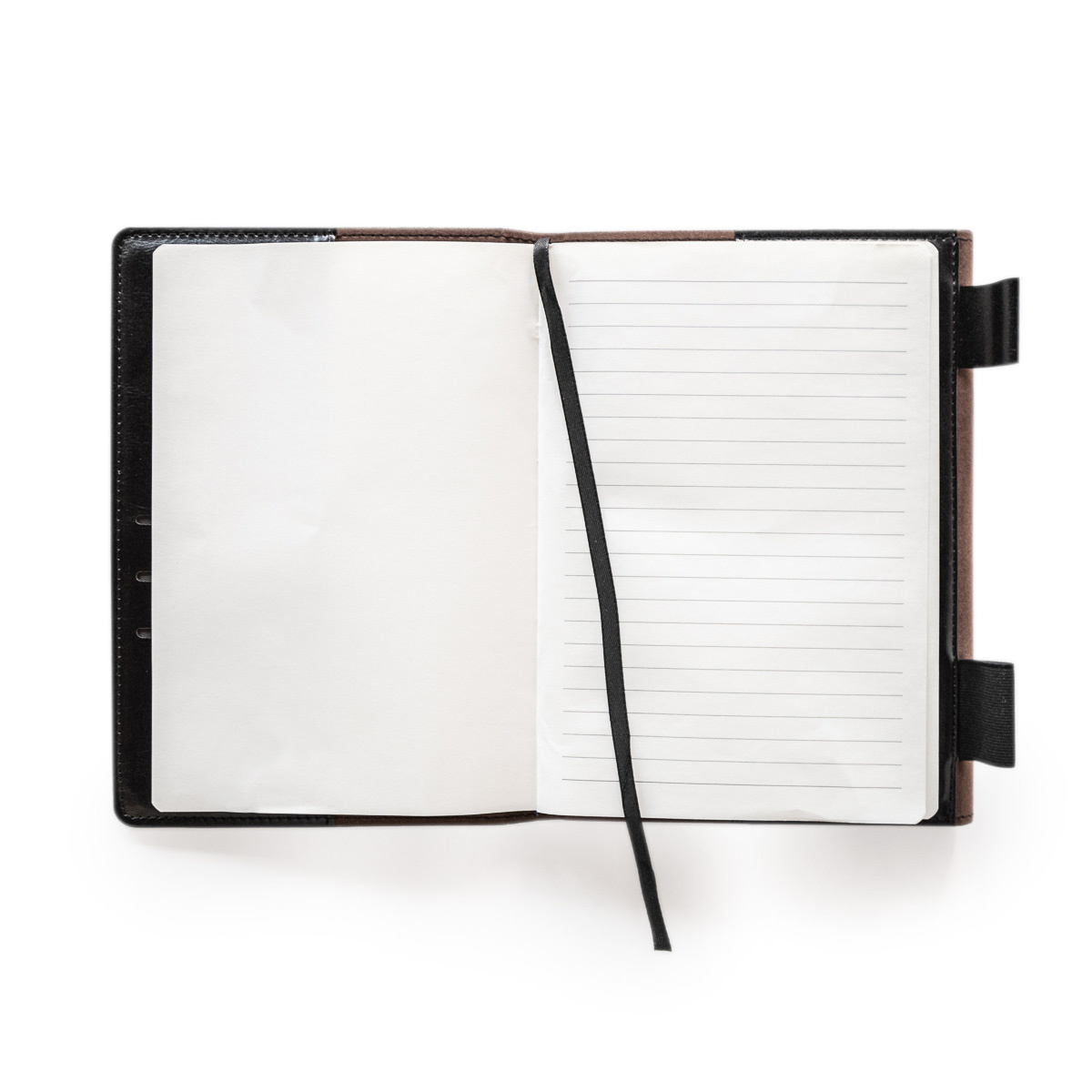 Wewnątrz okładki znajduje się miejsce na 3 wizytówki, długopis. Okładka nie jest umocowana na stałe do bloku notesu, tylko nasuwana na pierwsze strony, co daje możliwość wymiany notesu. Notes zamykany za pomocą paska z ekoskóry.